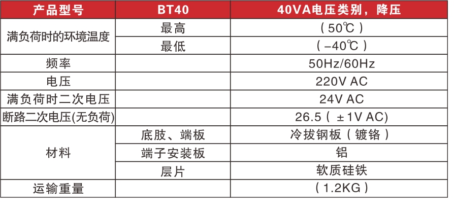 BT40系列變壓器用于馬達驅動器,分級控制及其它低壓控制電路。在額定負荷時能提供額定的二次輸出系統中的部件正常工作。